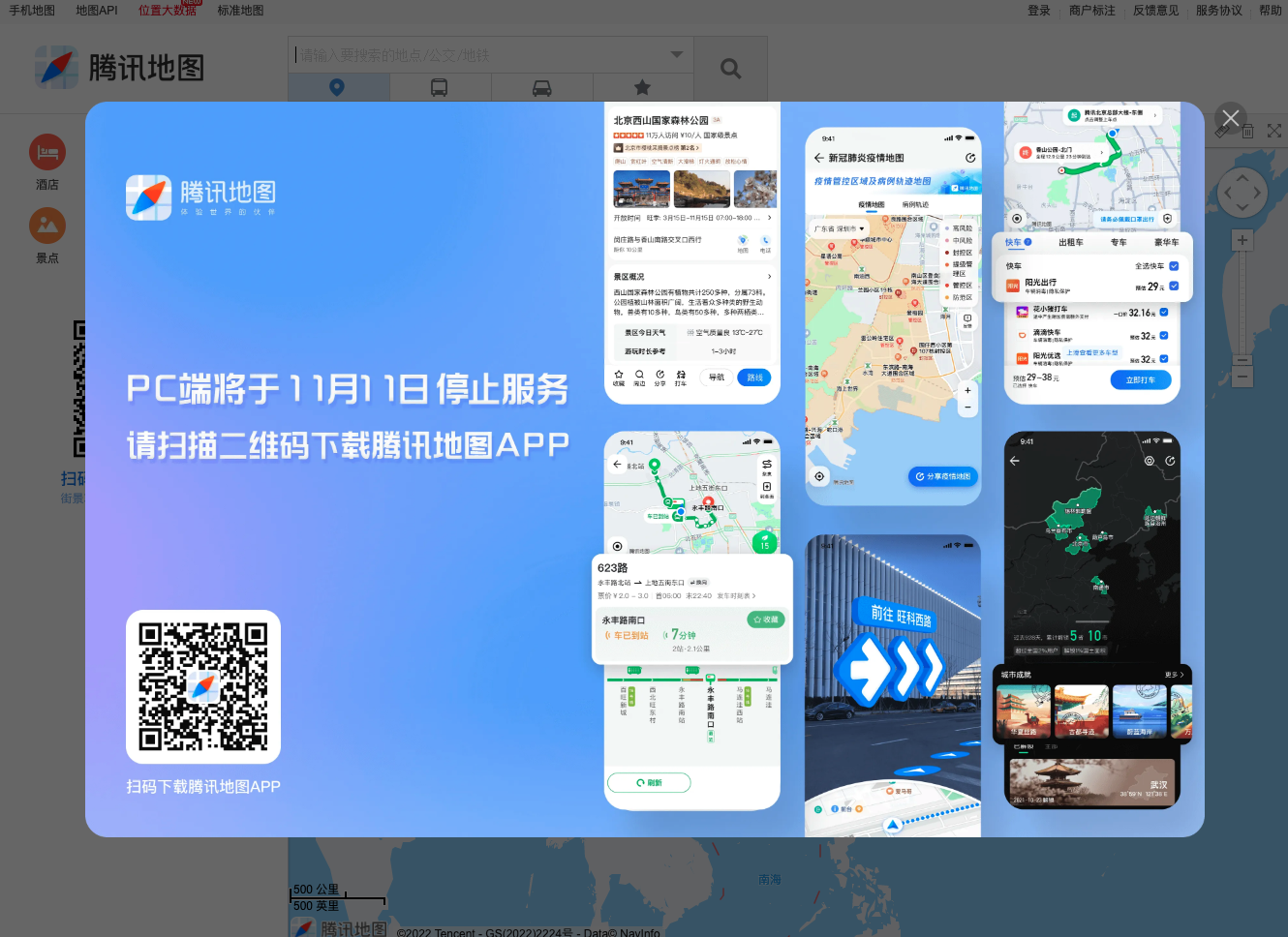据腾讯地图官网,腾讯地图PC端将于11月11日中止服务。