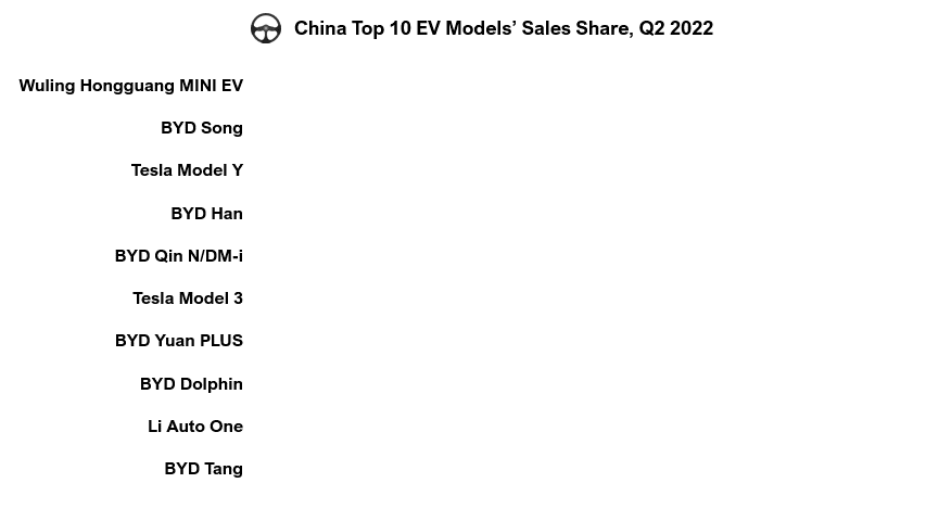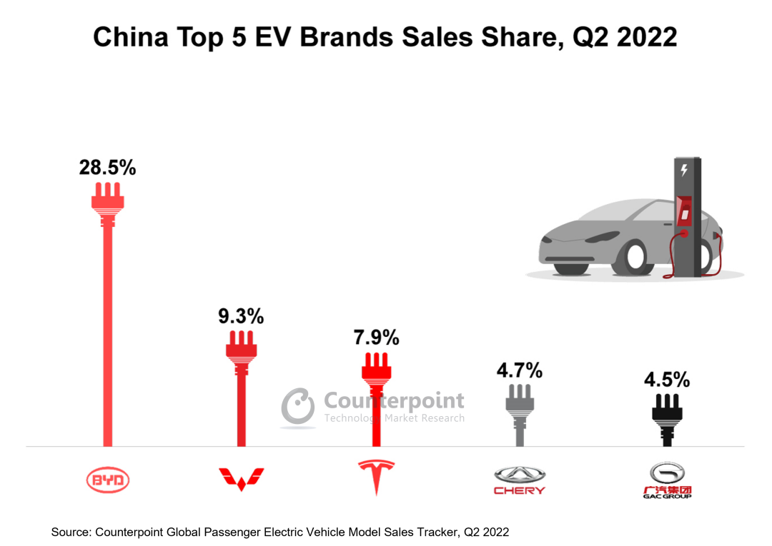 - 比亚迪坚持商场领先地位,其次是五菱和特斯拉