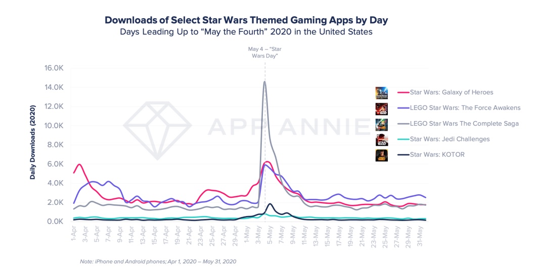 《星球大战》系列移动使用一般会在每年的 5 月 4 日之前呈现下载量激增。尤其是在 2020 年 5月 4 日,《乐高星球大战:完好的传奇》( LEGO Star Wars: The Complete Saga )的下载量超过了 1.4 万次,而之前一周的均匀每日下载量仅为 1400 次。《乐高星球大战:原力觉悟》(LEGO Star Wars: The Force Awakens)的下载量也添加了 190%,相同,《星球大战:银河英豪》(Star Wars: Galaxy of Heroes)在 5 月 4 日的下载量超过了曩昔两个月的任何一天。