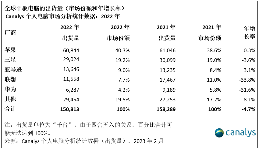 在接连三个季度下滑之后,全球平板电脑出货量有所增加,2022 年第四季度同比小幅增加1% 。苹果首要得益于新一代M2 iPad的推出,依然稳居商场首位,出货量到达 1900万台,全球商场份额占比高达 46% 。三星以 760 万台的出货量位居第二,出货量增加10%,商场份额占比 18%。亚马逊出货量到达 350 万台,同比下降 10%,位列第三。在黑色星期五前后,亚马逊对其Fire平板电脑进行大幅打折促销活动,然后避免了呈现更大降幅。联想和华为别离以51%和36%的跌幅排名第四和第五。其他厂商的总出货量小幅增加 4%,不难看出新进入平板电脑商场的厂商体现达观。