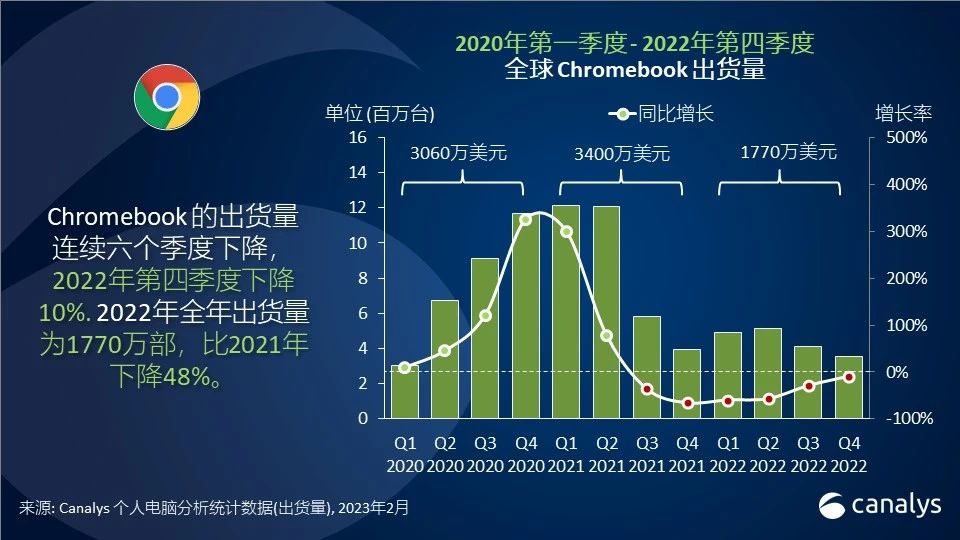 虽然Chromebook的出货量接连第六个季度的下滑,但 2022 年第四季度的降幅比前五个季度有所平缓,出货量同比仅下降 10%。Canalys高档分析师Ishan Dutt表明:“很多的零售扣头活动和校园收购量的增加给Chromebook笔记本电脑商场带来了一些喘息的时机。但 2022 年的总出货量与 2021 年比较下降了近 50%,由此不难看出“康复常态”对该细分商场的影响程度。因为向商用商场的拓宽依然具有应战,且顾客开销也将受到限制,因而Chromebook厂商正在等候美国、日本和欧洲等要害商场教育设备更新周期的到来,以助其再次拉动销量增加。鉴于现在政府部门预算面对压力,并且短期库存整理依然是厂商和途径在返校季前的要点,因而Canalys估计本年完成增加的时机迷茫。2024 年,跟着新冠疫情顶峰期间购买的设备到达运用寿命结尾,商场才有或许呈现大幅增加。因为学生和教师对频频运用的设备希望更高,所以这也是一个供给更高价值产品的时机。跟着数字课程已牢牢嵌入教育系统, Chromebook笔记本电脑的长时间需求将会继续下去且具有周期性。”