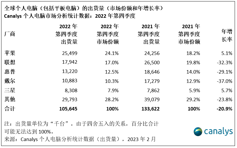 在 2022 年第四季度的个人电脑商场(包含台式机、笔记本和平板)中,苹果以 2550 万台的出货量位居榜首,同比增加5%,商场份额扩展至24%。联想排在第二位,从去年同期开端让坐落苹果,出货量为 1790 万台,同比下降 32%。惠普和戴尔别离以 1320 万台和 1090 万台的出货量位居第三和第四。在平板电脑增加的支持下,三星以同比增加6%,出货量830万台的成绩排名第五。