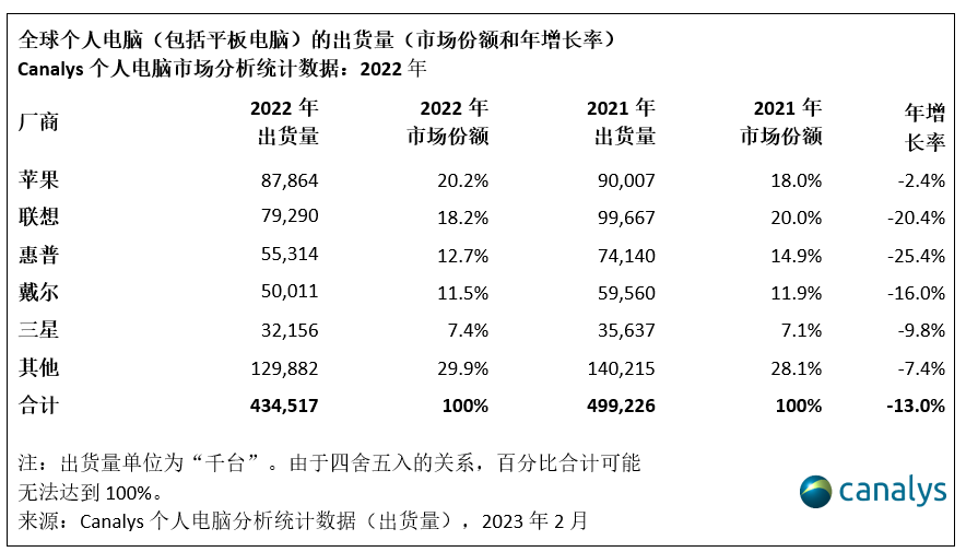 2022 年第四季度和 2022 年全年全球个人电脑(包含平板电脑)商场、平板电脑商场和Chromebook商场出货量计算: