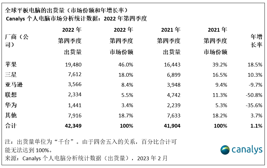 Canalys分析师Himani Mukka表明:“虽然经济状况不佳,但对平板电脑的需求依然相对健康。头部厂商苹果经过推出新的高端产品,协助推进商场全体增加。这表明顾客将对有吸引力的立异产品给出活跃回应。第四季度,在消费范畴,厂商和零售商在节日季推出大幅扣头和促销活动,顾客的预算也有所增加。而在商用范畴,企业和政府都对IT开销采取了愈加慎重的情绪,放置了一些包含平板电脑收购在内的数字化转型方案。”
