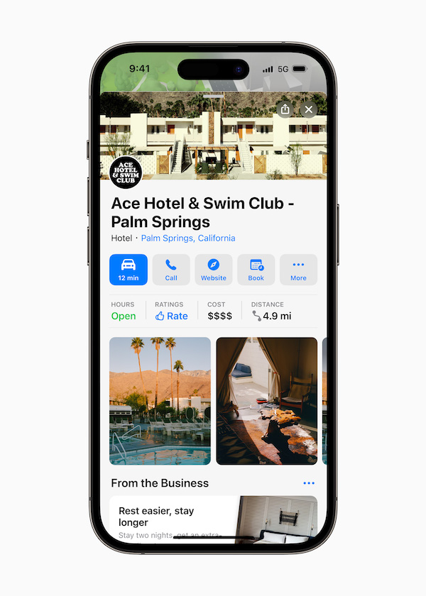 据苹果介绍,有了 Business Connect,全世界的企业都能够直接在 Apple 地图 app 的互动式地点卡中办理自己的信息,比方增加并更新相片与 logo、让顾客在地图 app 里直接点餐或预定座位、向顾客介绍特别促销活动等。